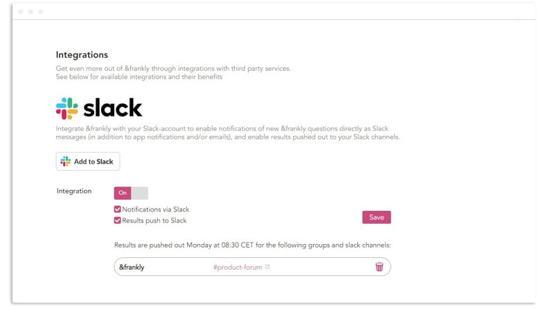 Enable Slack integration with Simployer &frankly through a single click from your Administrator settings when logged in; click the Add to Slack button and you’re done!